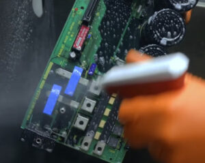Once the budget is accepted, the disassembly and testing of the equipment begins within the electronics department. The equipment will be thoroughly cleaned, removing grease, dirt and corrosive elements that are present on the plates. The problem of short circuit or loss of insulation is always present in equipment that is dirty or subjected to environmental load environments. All this is due to particles, fats, oils, as well as dust and corrosion material. After cleaning, it will go to the drying tunnel and the actual repair will begin.